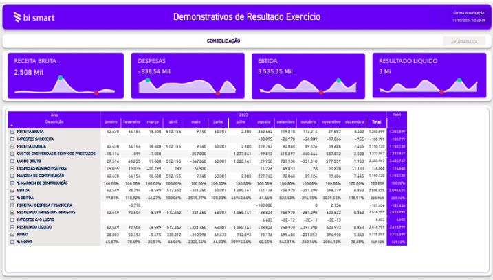 Acompanhe o Demonstrativo de Resultados do Exercício de forma clara, consolidada e visual.