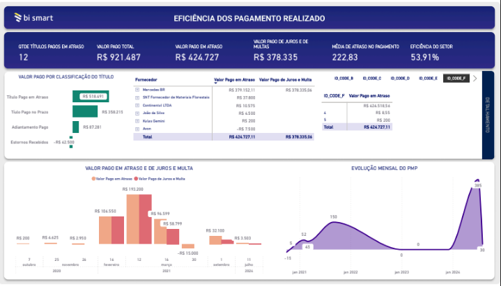 Monitore a eficiência dos pagamentos, identificando atrasos, juros, multas e impactos financeiros.