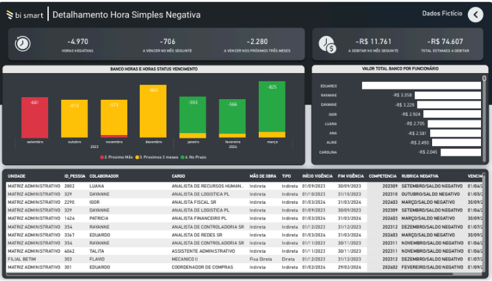 Visualize rapidamente o volume de horas negativas, vencimentos e valores a debitar.